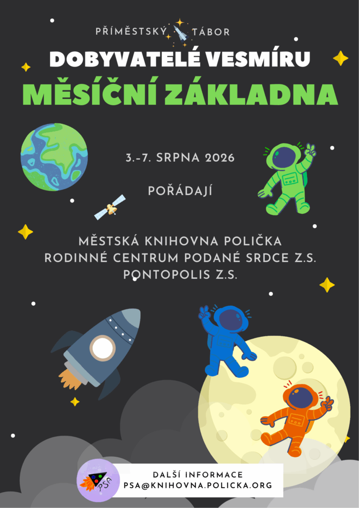 Dobyvatelé vesmíru naší vesmírné agentury Půda Space Administration, letos s podtitulem Měsíční základna, se vydají za dobrodružstvím mezi 3. a 7. srpnem 2026 denně mezi 8:00 a 14:00 (16:00) v prostorách Půdy a venku v přírodě po Poličce a okolí.